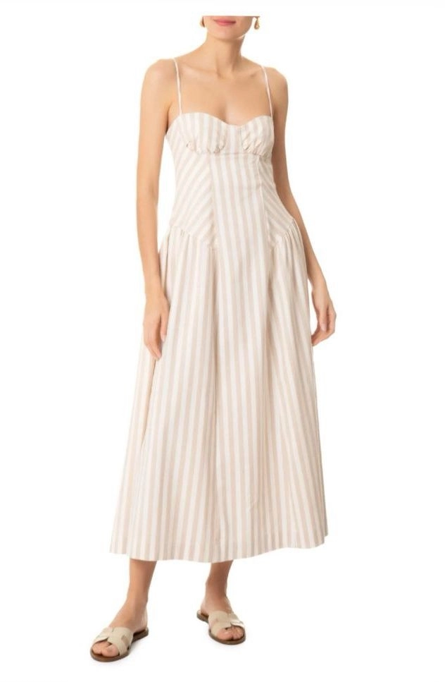 Vestido Farm Midi Listrado Bege com Alças Finas – Leve e Sofisticado