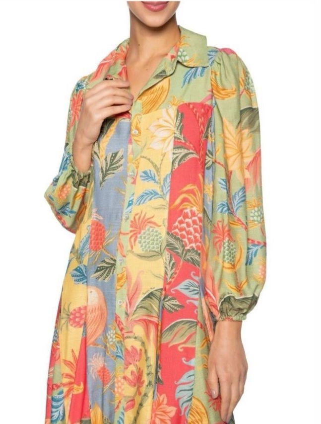 Vestido Farm Camisa Curto Estampado Tropical Colorido – Manga Longa e Botões Frontais