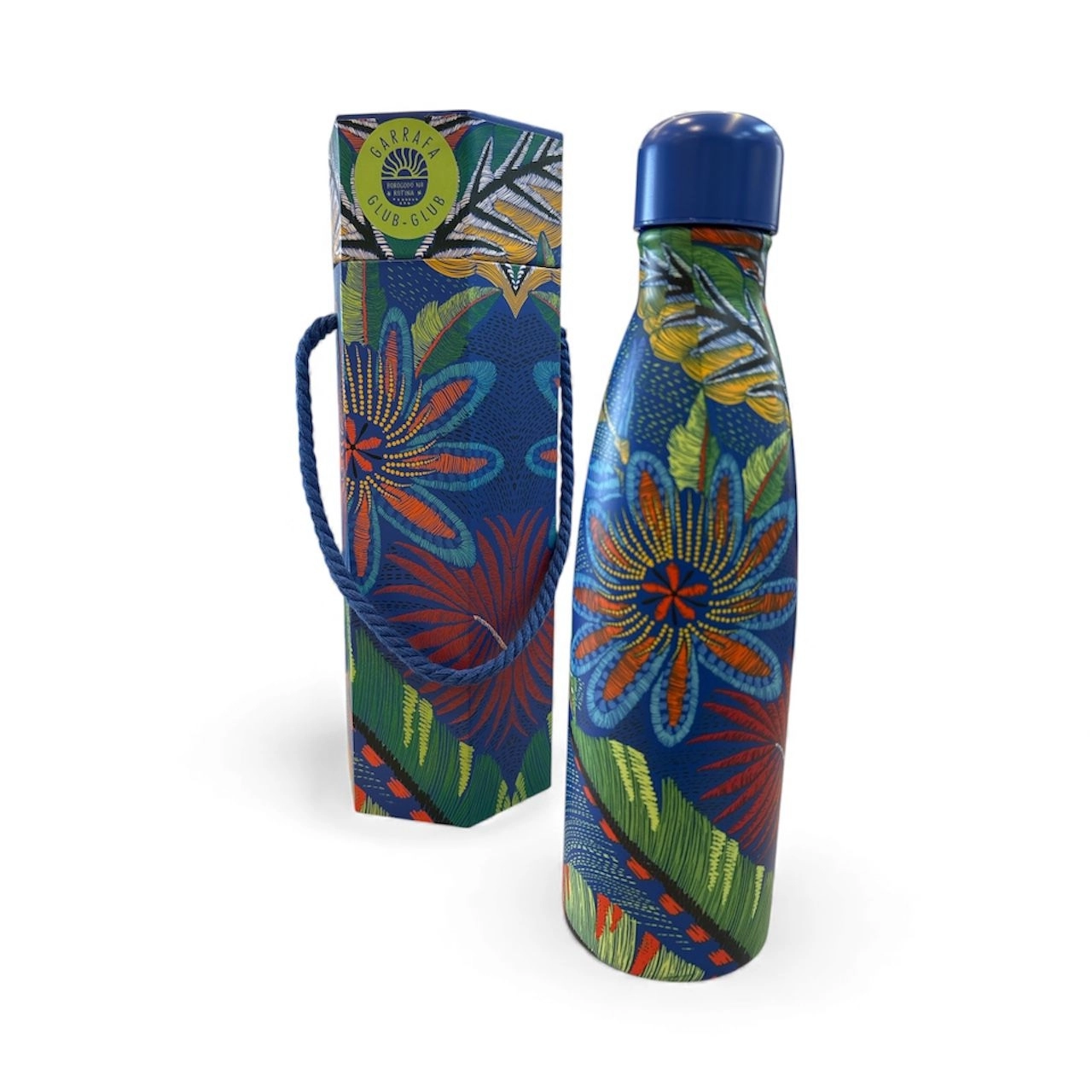 A garrafa térmica GLUB-GLUB 500ml na versão tropical azul combina funcionalidade e personalidade em um único produto. Sua estampa vibrante com flores e folhagens garante um visual moderno e marcante, ideal para quem busca estilo até nos pequenos detalhes do dia a dia.